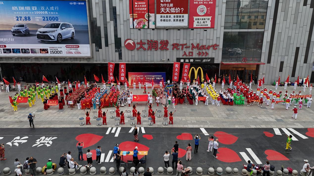 30人鼓樂團(tuán)方陣,精神飽滿閃亮登場,瞬間點(diǎn)燃現(xiàn)場氣氛;隨后身穿紅色T恤的百人舞團(tuán),臺(tái)上臺(tái)下同跳《丁香花》,優(yōu)美舞姿展現(xiàn)出濃郁地域文化特色……
