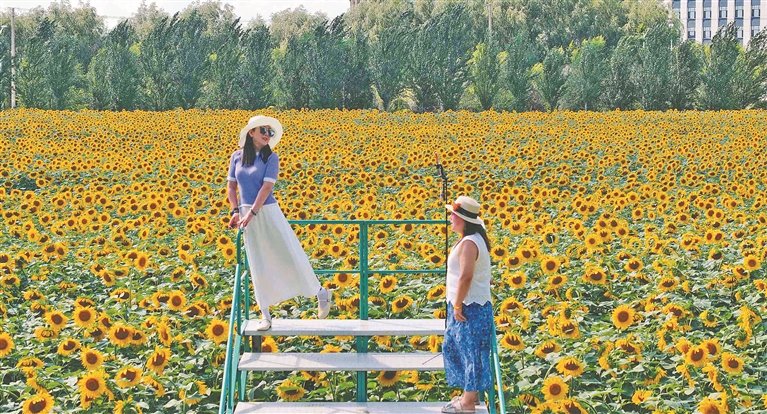 近日,哈爾濱市東方學(xué)院的校園里,30萬株向日葵進入盛花期,層層疊疊的金黃花瓣在校園里組成金色矩陣,連蜂蝶振翅都沾滿蜜糖色的光斑。風(fēng)掠過時,葉片翻卷出翡翠色的浪涌,花盤碰撞發(fā)出細雨般的窸窣聲,空氣里浮動著類似烤面包的溫暖香氣?;êig的小橋上,愛花的市民在這里打卡拍照,定格最美瞬間。