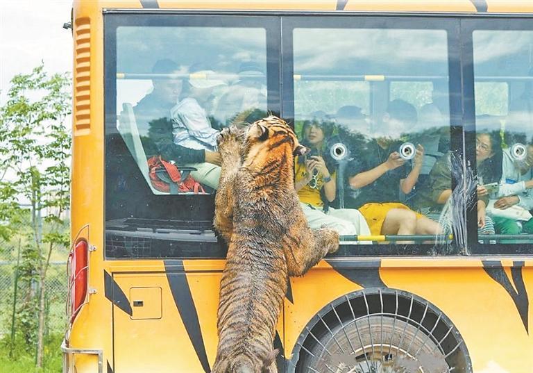 在驚險(xiǎn)觀光車上,游客可以通過(guò)特制裝置給成年虎投喂食物,體驗(yàn)“虎口投食”的刺激?!皬膩?lái)沒(méi)想過(guò)能這么近距離接觸東北虎,看著它從我手中的夾子吃肉,既緊張又激動(dòng)!”來(lái)自上海的大學(xué)生語(yǔ)氣難掩興奮。