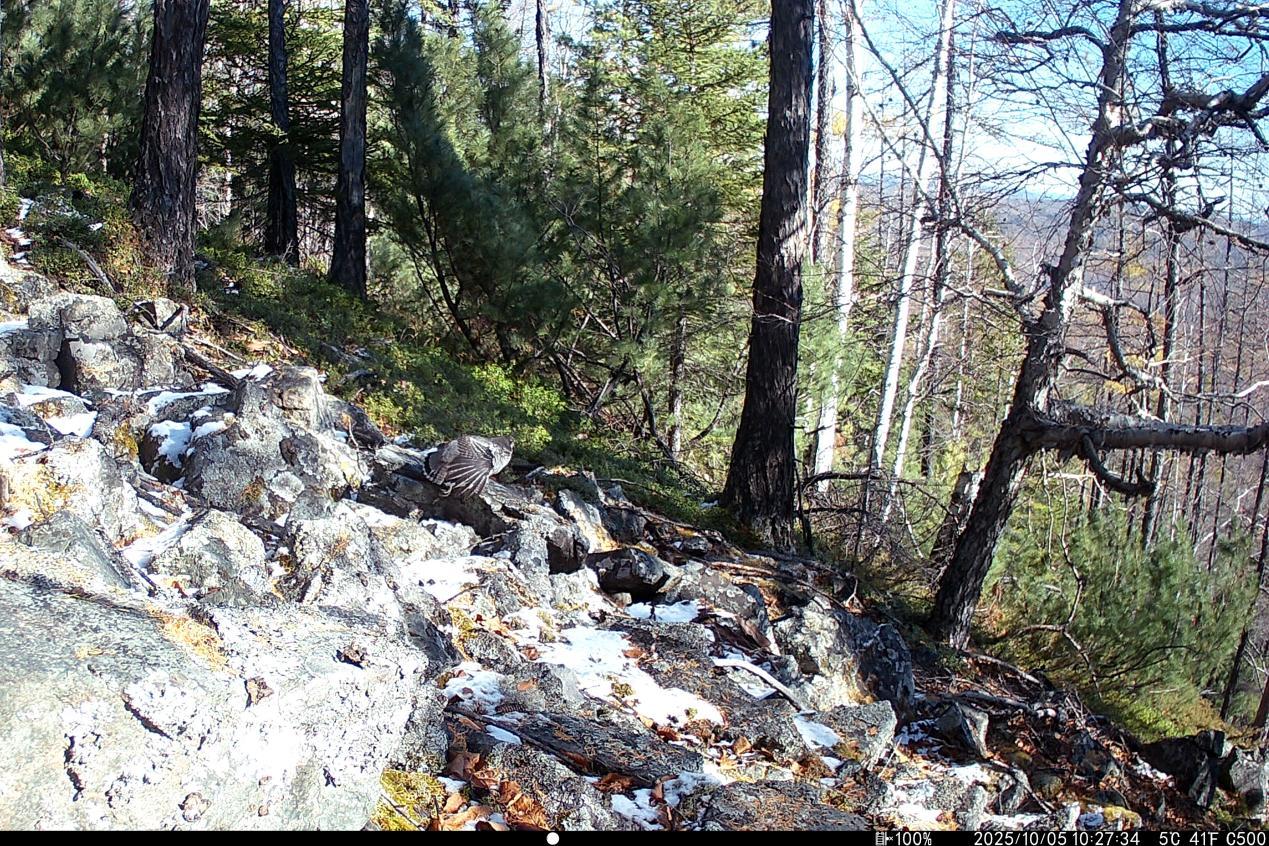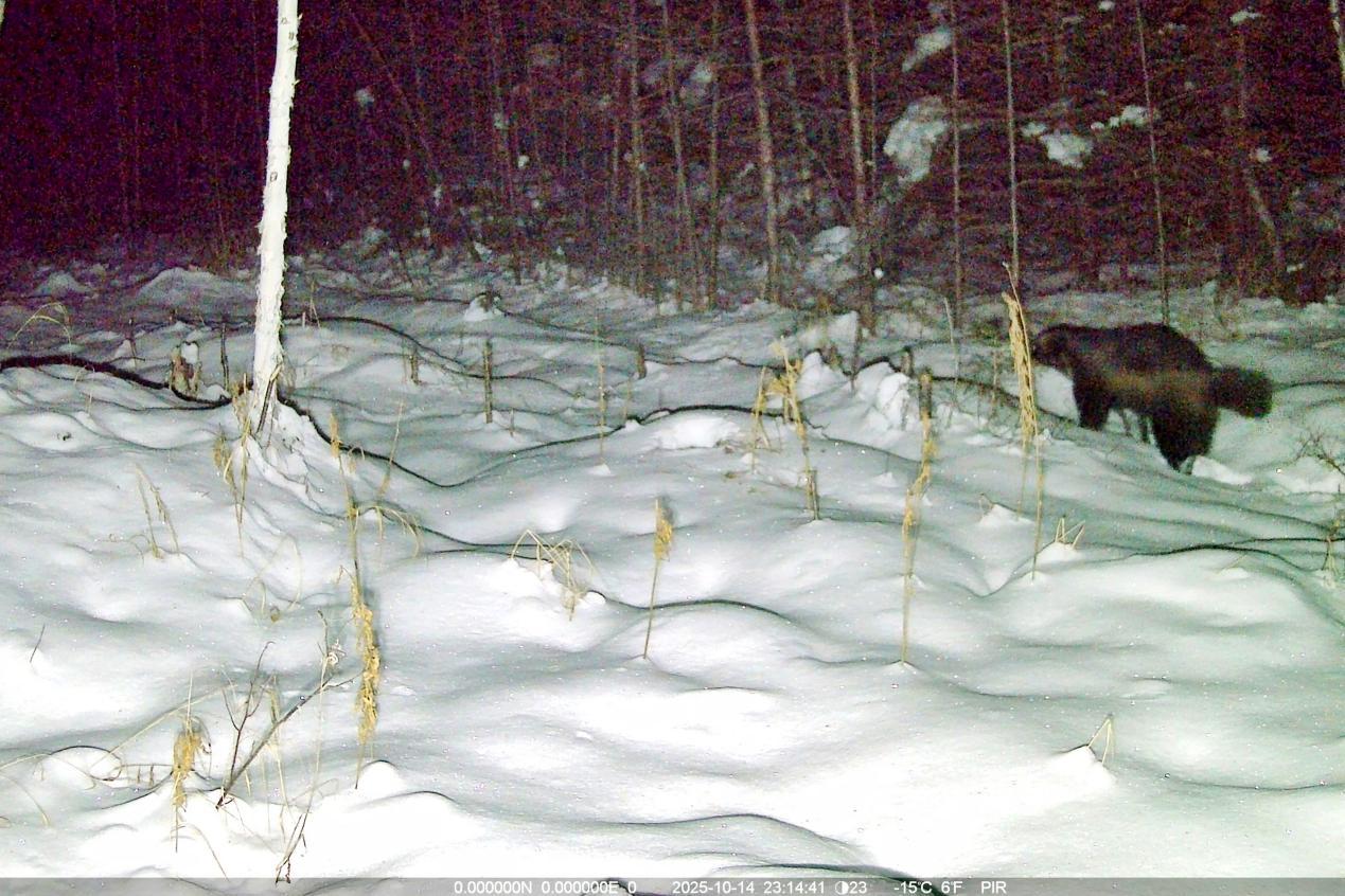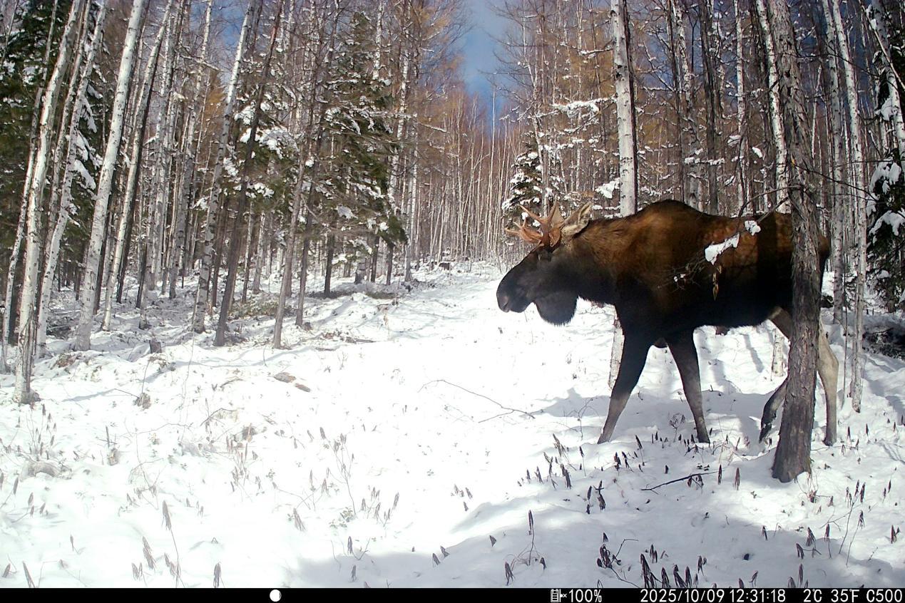 項目實施中,工作人員克服地形復(fù)雜、嚴(yán)寒天氣等挑戰(zhàn),深入森林公園腹地完成15條冬季樣線調(diào)查,并同步開展97臺紅外相機的維護與回收工作,累計獲取了大量珍貴野生動物影像資料及活動數(shù)據(jù)。監(jiān)測范圍內(nèi),駝鹿、原麝、貂熊、紫貂、猞猁、棕熊、馬鹿、花尾榛雞等國家重點保護野生動物相繼現(xiàn)身,更捕捉到原麝覓食、棕熊帶崽等罕見畫面,直觀印證了森林公園內(nèi)棲息地質(zhì)量優(yōu)良、生態(tài)保護成效顯著。