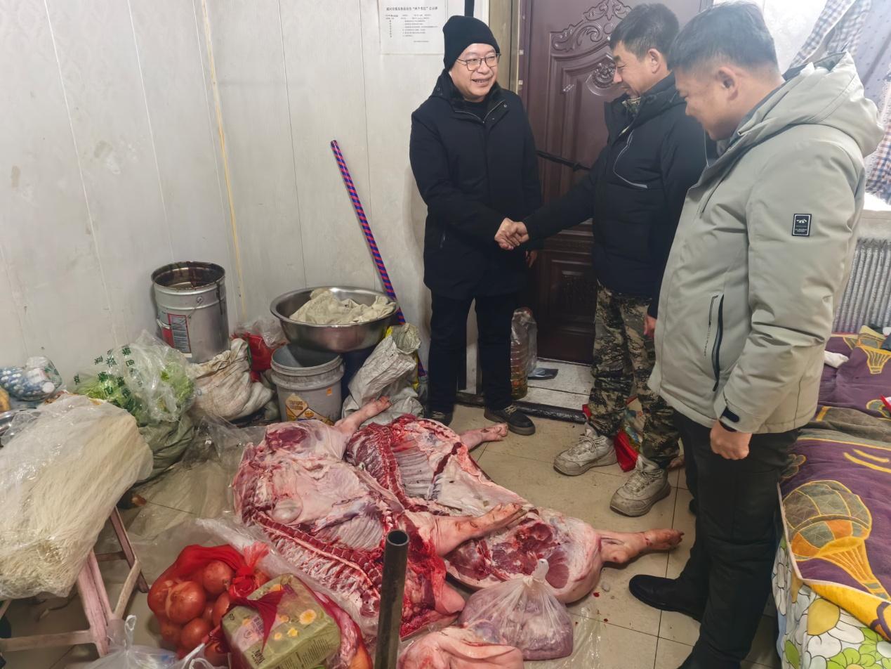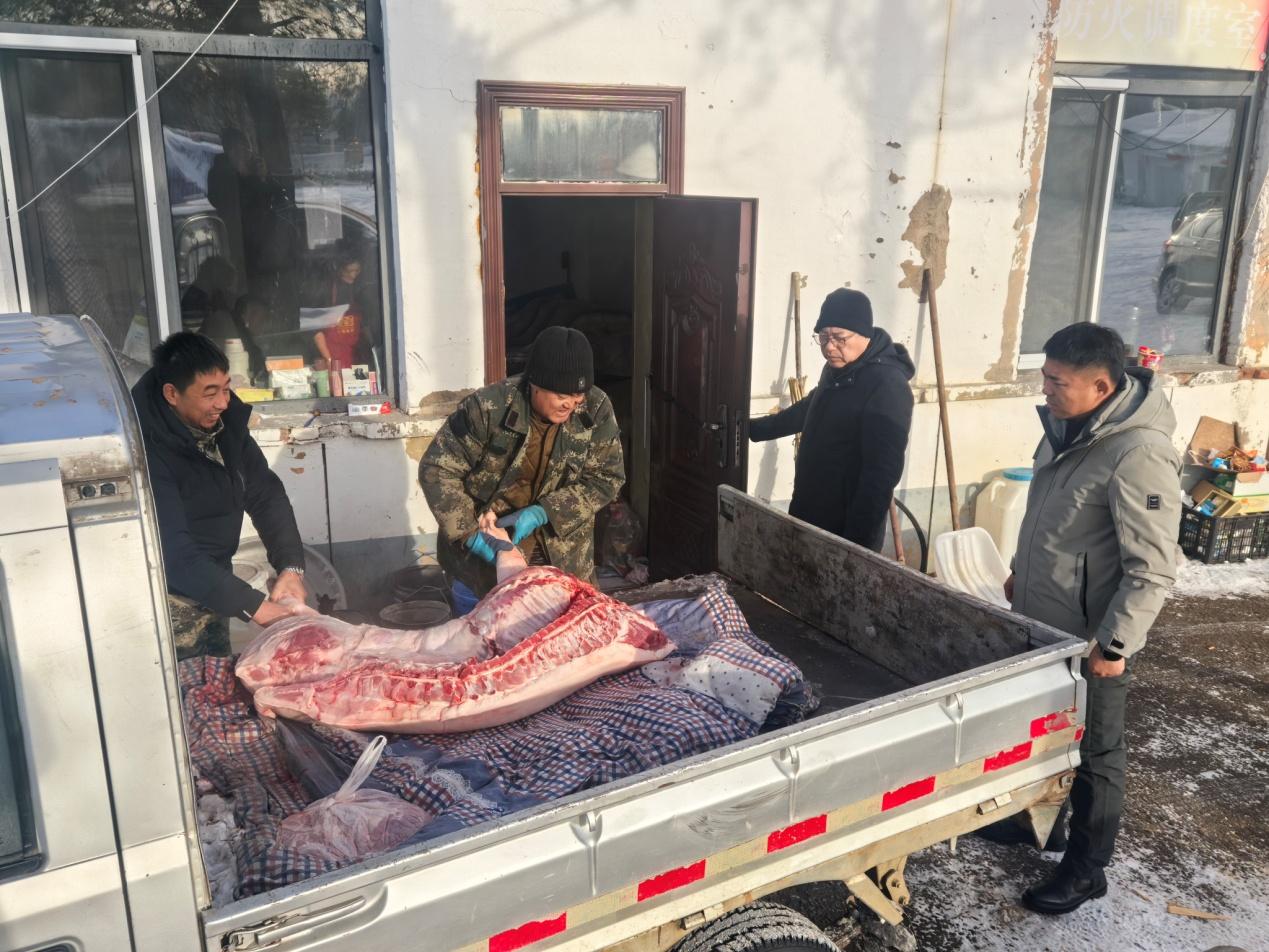 “冬季深山作業(yè),職工的御寒保暖和飲食保障是我們最牽掛的事?!背焙恿謭?chǎng)始終堅(jiān)持“職工的‘心上事’就是林場(chǎng)的‘要緊事’”理念,提前與各作業(yè)組精準(zhǔn)對(duì)接,深入了解一線實(shí)際困難與需求,針對(duì)性籌備慰問物資。深入冬季營(yíng)林生產(chǎn)作業(yè)點(diǎn),開展歲末一線慰問活動(dòng),慰問車隊(duì)滿載 390 斤豬肉、新鮮水果、各類蔬菜、防寒棉衣、保暖手套等冬季防護(hù)用品和生活物資。抵達(dá)作業(yè)點(diǎn)后,慰問組詳細(xì)查看了臨時(shí)板房的取暖設(shè)備運(yùn)行、食宿環(huán)境保障等情況,仔細(xì)檢查供暖管線、消防設(shè)施等安全隱患點(diǎn),確保冬季生產(chǎn)生活安全?!耙归g宿舍溫度能達(dá)到多少?”、“日常食材儲(chǔ)存是否方便”,詢問大家的工作生活狀況,傾聽職工訴求。針對(duì)長(zhǎng)期駐守作業(yè)點(diǎn)可能出現(xiàn)的食材新鮮度不足問題,林場(chǎng)黨支部副書記表示,“從下周起,定期配送新鮮蔬菜,保障大家營(yíng)養(yǎng)均衡,讓大家吃得放心、干得舒心?!睜I(yíng)林副場(chǎng)長(zhǎng)圍繞冬季營(yíng)林作業(yè)規(guī)范、機(jī)械設(shè)備防寒維護(hù)等內(nèi)容開展專業(yè)指導(dǎo),提醒隊(duì)員們嚴(yán)守安全生產(chǎn)規(guī)程,做好防寒防凍措施,確保生產(chǎn)安全與作業(yè)質(zhì)量雙達(dá)標(biāo)。