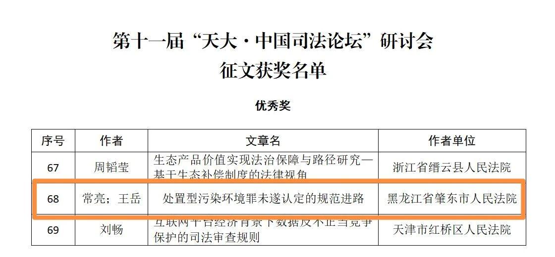 黑龍江經(jīng)濟網(wǎng)訊(董慧瑩 李雪松)近日,由中國行為法學(xué)會司法專業(yè)委員會主辦、天津大學(xué)承辦的第十一屆“天大·中國司法論壇”研討會征文獲獎名單公布。本次征文活動共收到投稿論文620篇,經(jīng)評委會嚴(yán)格評審,共選出一等獎8個、二等獎24個、三等獎48個、優(yōu)秀獎102個。其中,肇東市人民法院審管辦副主任常亮、審管辦書記員王岳撰寫的學(xué)術(shù)論文《處置型污染環(huán)境罪未遂認(rèn)定的規(guī)范進路》榮獲優(yōu)秀獎。