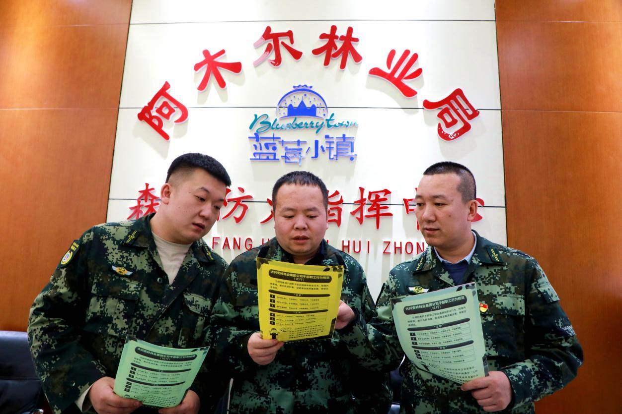 阿木爾林業(yè)局防火辦職工利用宣傳單,學(xué)習(xí)《集團(tuán)干部職工行為規(guī)范》(王力 攝)