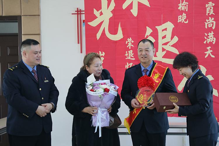 客運(yùn)段團(tuán)委書記張蔚萌代表段黨委,為馮春生同志送上誠摯的祝福,并鄭重地遞上鐫刻著“光榮退休”字樣的紀(jì)念牌。緊接著,班組精心準(zhǔn)備的一份“驚喜”將現(xiàn)場氣氛推向高潮——馮春生同志的愛人捧著鮮花,在大家的掌聲中走上臺來。夫妻二人相視而笑,這份來自家庭的溫暖與支持,讓馮春生同志感動不已。